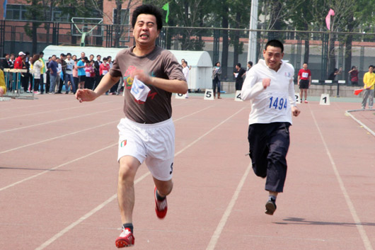 在教职工运动会中,计算机公司姚山和朱晓东两位老师参加了男子教工青年组100米的比赛,分别获得了小组第三和小组第一的成绩,赛后的采访中,两位老师笑着说到成绩不重要,重要的是参与,明年还是会参加。