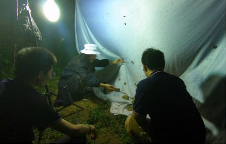 夜间,实践团的队员们还在田间地头进行了灯诱操作。在强光的吸引下,不同种类的天牛、金龟、蛾子都“跑”了过来,这些生物种类繁多,颜色多不相同,让人应接不暇,昆虫被强光吸引,同学们被这些昆虫“吸引”。蛾子的种类繁多,带队教师陈静怡为同学们一一介绍各种昆虫的信息,就像一个行走的昆虫百科全书。