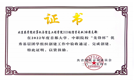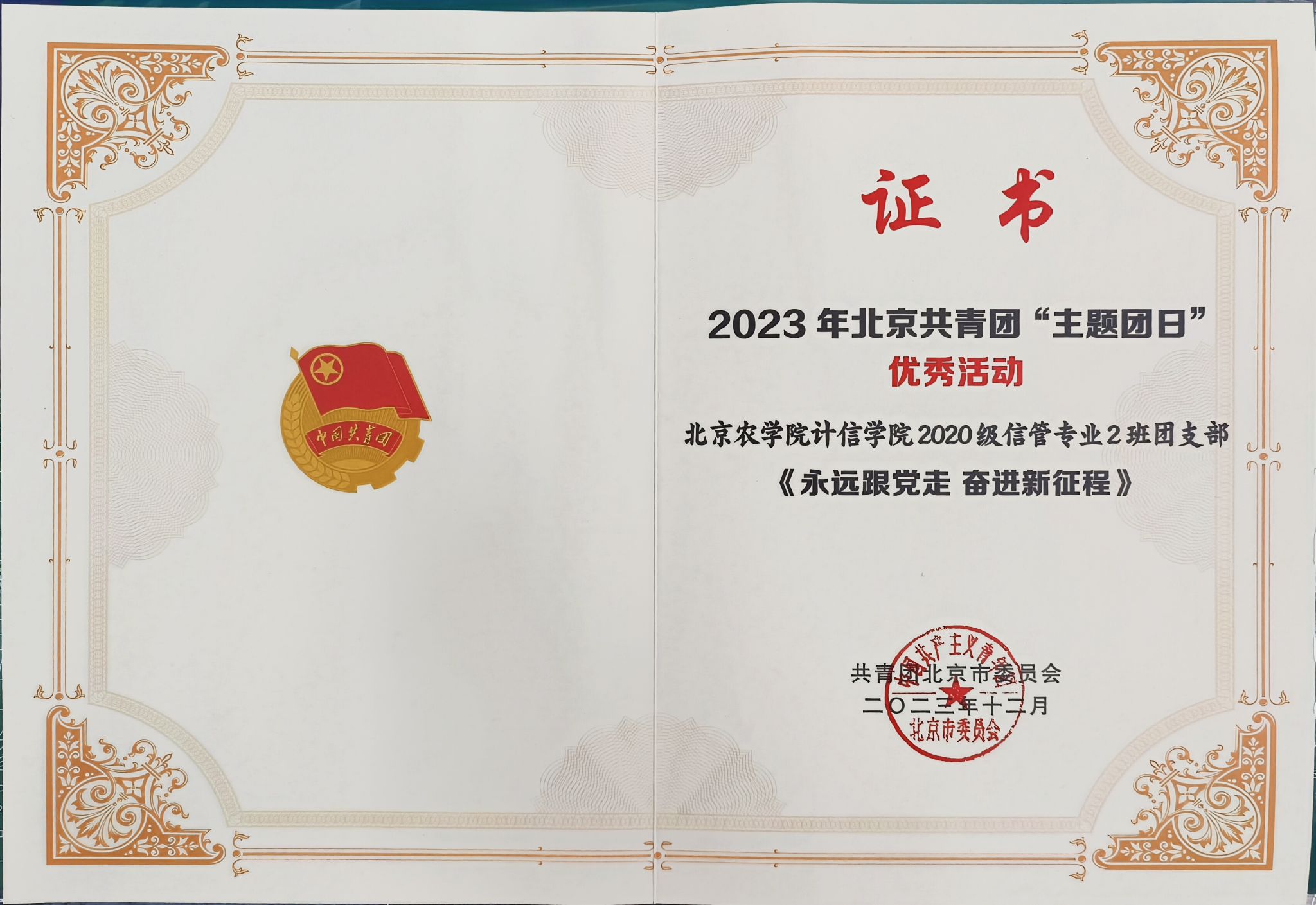 在北京共青团开展的“十佳主题团日”和“团建百强”品牌项目评选活动中,英国威廉希尔英文官网2020级信管专业2班团支部开展的“永远跟党走奋进新征程”主题团日活动获评2023年北京共青团“主题活动”优秀活动。