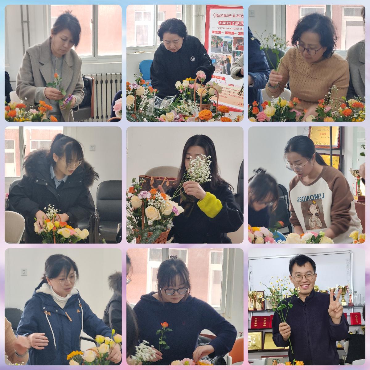 活动开始,花艺专家为大家带来了精彩的讲解,介绍了各类鲜花的品种、养护技巧以及插花艺术的基础知识。随后,教职工们亲手体验插花创作,大家纷纷动手挑选心仪的花材,修剪枝条、搭配色系,将向日葵象征的科研热情、康乃馨代表的育人初心融入花艺作品。在温馨愉快的氛围中,大家都在花艺作品中表达了自己对美的理解。活动最后,大家纷纷表示,这次活动不仅让大家收获了新知识、感受到了美的艺术魅力,也在工作之余通过亲身体验放松心情。