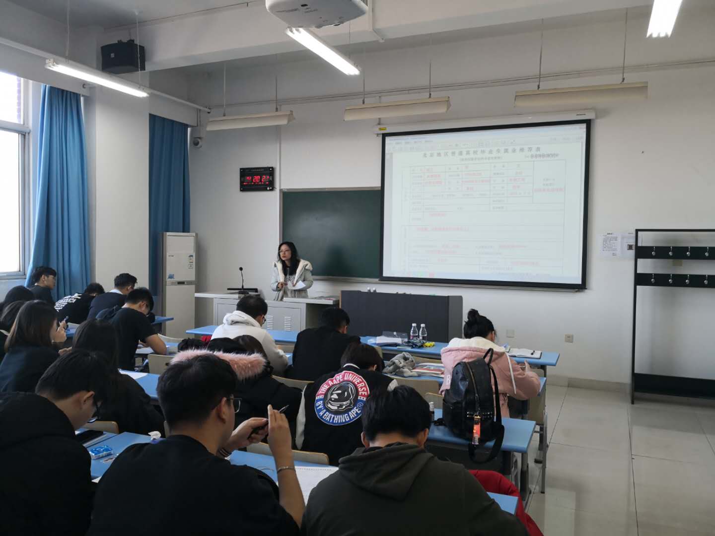 会上,郭贵川老师结合国家和北京市的最新就业政策 分析了目前的就业形势,再通过往年毕业生就业去向及计算机类专业的特点分析了同学们重点的就业方向。之后,郭老师对《北京地区高校毕业生就业试用手册2018》进行了解读,详细为大家讲解了与就业相关的流程和重要表格,并从用人单位、公司和社会等几方面为同学们介绍了很多实用的就业技巧。