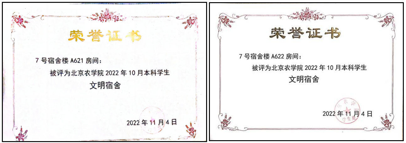 班级同学遵守校规校纪,具有良好的道德品质。在宿舍建设方面,成绩显著,班内无脏、乱、差宿舍,宿舍成绩优秀率达到了百分之百,累计获得7次文明宿舍。其中,7A622宿舍曾4次被评为威廉希尔williamhill官方网站本科员工文明宿舍。
